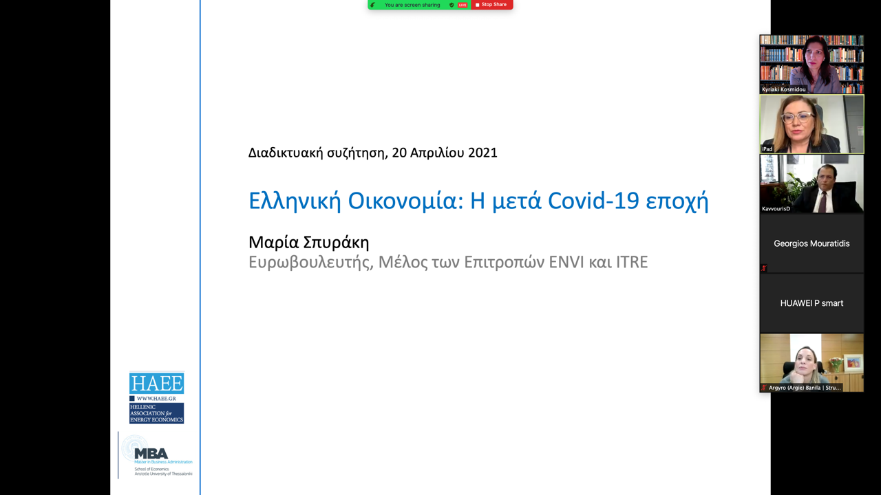 Την Τρίτη 20/4/2021 πραγματοποιήθηκε η διαδικτυακή εκδήλωση με θέμα "Ελληνική Οικονομία: Η μετά– Covid 19 εποχή" που διοργάνωσε η Εταιρία Ενεργειακής Οικονομίας-HAEE και το Πρόγραμμα Μεταπτυχιακών Σπουδών στη Διοίκηση Επιχειρήσεων-MBA ΑΠΘ με πρωτοβουλία και συντονισμό της Καθηγήτριας και Προέδρου του Τμήματος Οικονομικών Επιστημών ΑΠΘ Κυριακής Κοσμίδου.